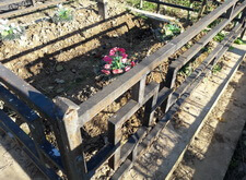 Возвращаемся на могилу. Подготавливаем оградку к покраске, зачищая её от старого покрытия. Параллельно устанавливаем подставку для памятника.