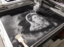 Как только работа с надписями была завершена, гравировальным станком нанесли на плиту портреты покойных.