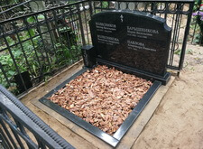 На утолщённую балку крепим памятник с заранее нанесёнными надписями. У подножья надгробья устанавливаем вазу с гравировкой, цветник засыпаем корой. Выступающее за границы цветника бетонное основание выглядит достаточно неряшливо, однако клиент не пожелал его скрывать или облицовывать.